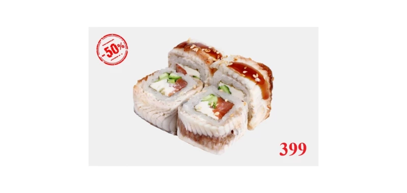 8 шт: рис, нори, угорь, лосось, огурец, сыр сливочный "Креметто", кунжут, унаги, имбирь, васаби